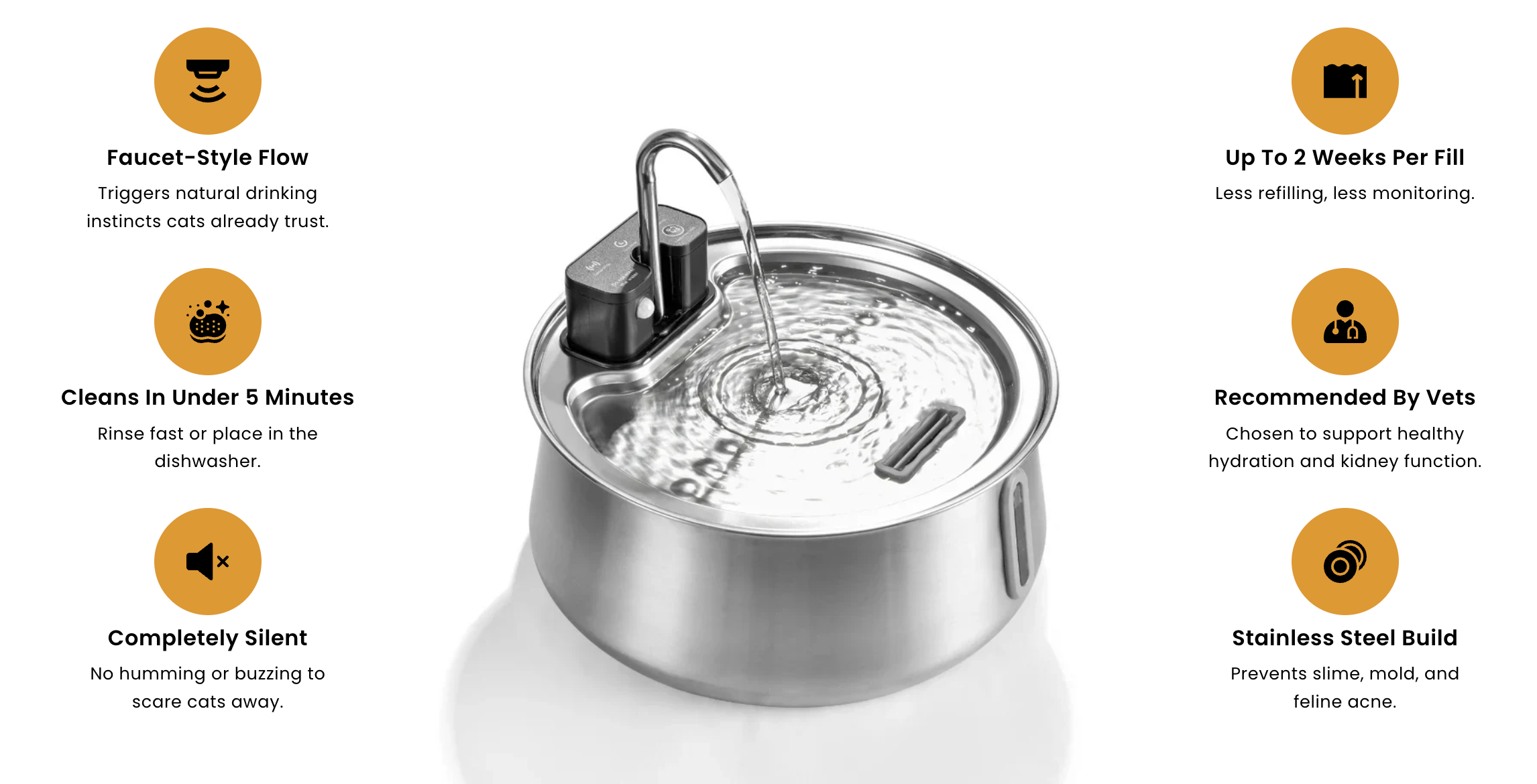 Mange skåle tvinger kattens følsomme knurhår til at presse mod siderne, hvilket kan give ubehag og få dem til at undgå at drikke. KittySpouts brede og lave skål lader katten drikke uden pres, så den føler sig komfortabel og drikker i længere tid.